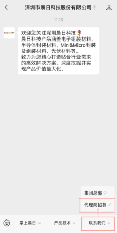 Tìm ki?m Official Account WeChat 「深圳市晨日科技股份有限公司」, nh?p vào thanh menu d??i cùng 「Liên h? chúng t?i」→「Tuy?n d?ng ??i ly」; Chúng t?i s? t? ??ng phan b? qu?n ly khu v?c t??ng ?ng d?a trên th?ng tin b?n ?i?n.